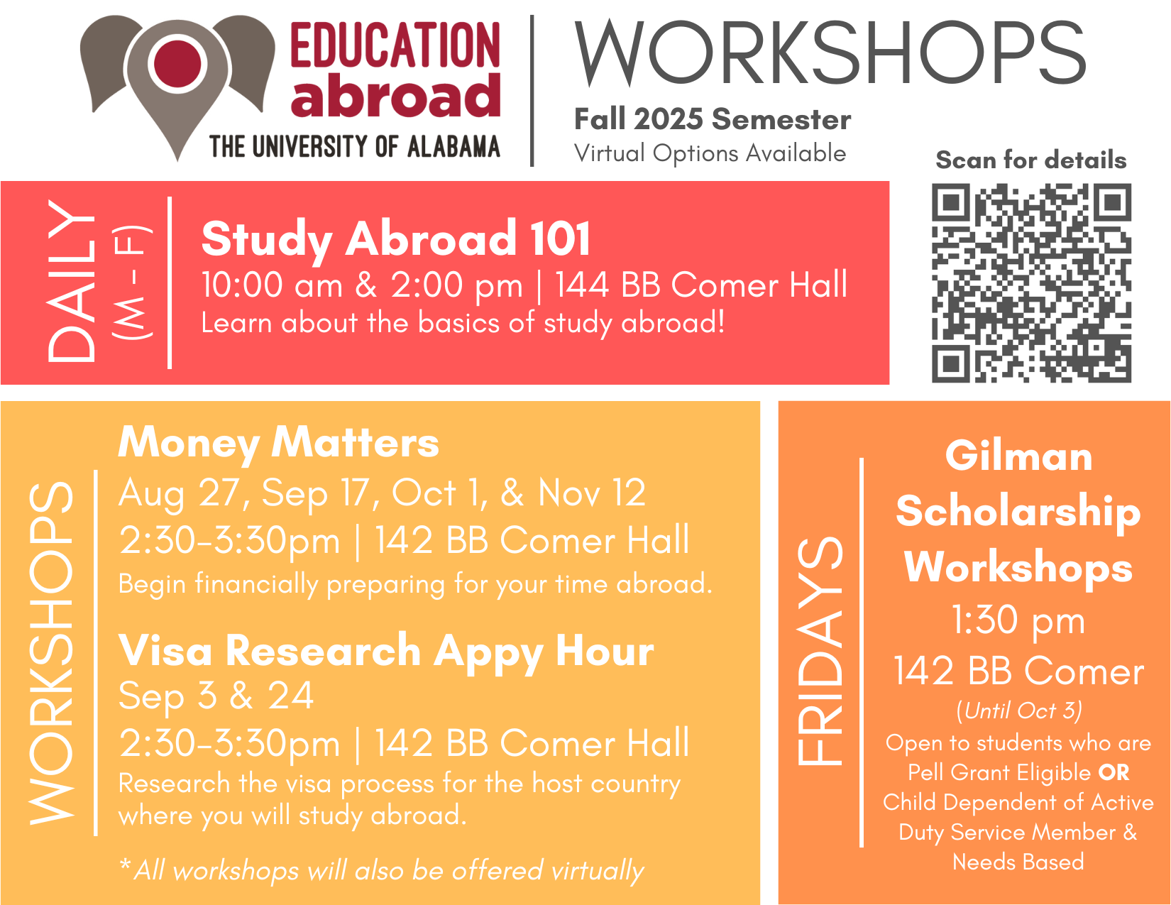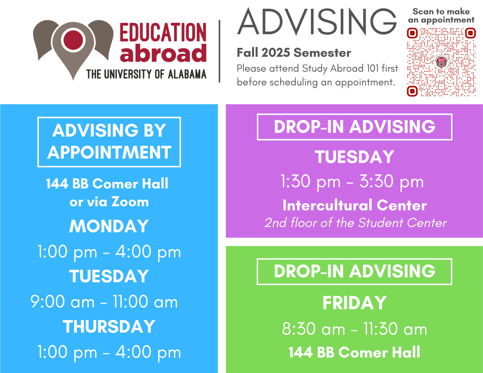 After seeing Study Abroad 101, meeting with your study abroad advisor is the next thing to do! We offer specialized advising for all colleges. Appointments can be made on our website on the Schedule an Appointment tab or feel free to come to any of our Drop-In Advising or Workshops listed in the images below. Your Education Abroad advisor is there to help you find the right program, and assist you in the study abroad process!